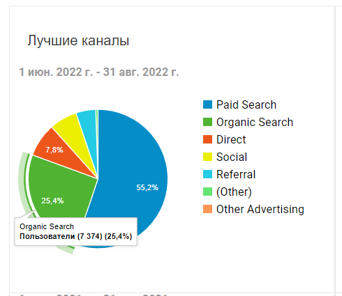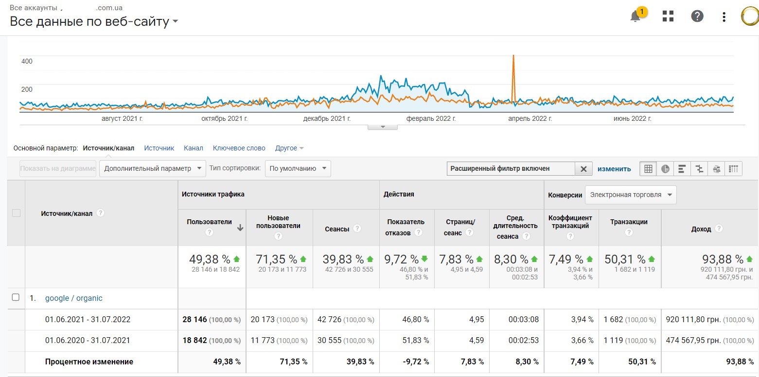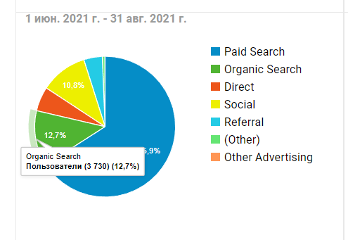 Основной источник - платный трафик. До начала SEO продвижения сайта мы вели и продолжаем вести клиенту рекламу Google Shopping и рекламу в соц. сетях.