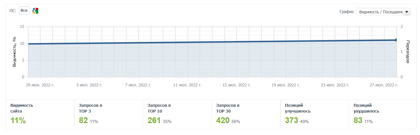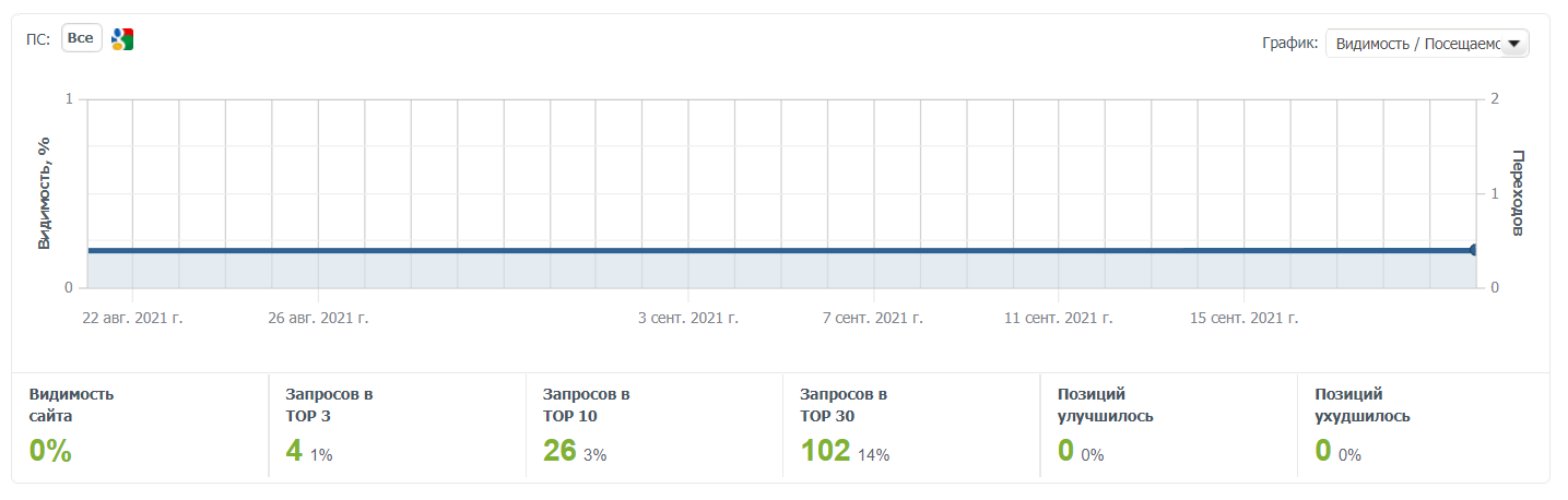 Согласно оценке видимости сайта по поисковым запросам с помощью сервиса Serpstat на момент начала работ по целевым запросам сайт практически не отображался и соответственно практически не получал целевой органический трафик.